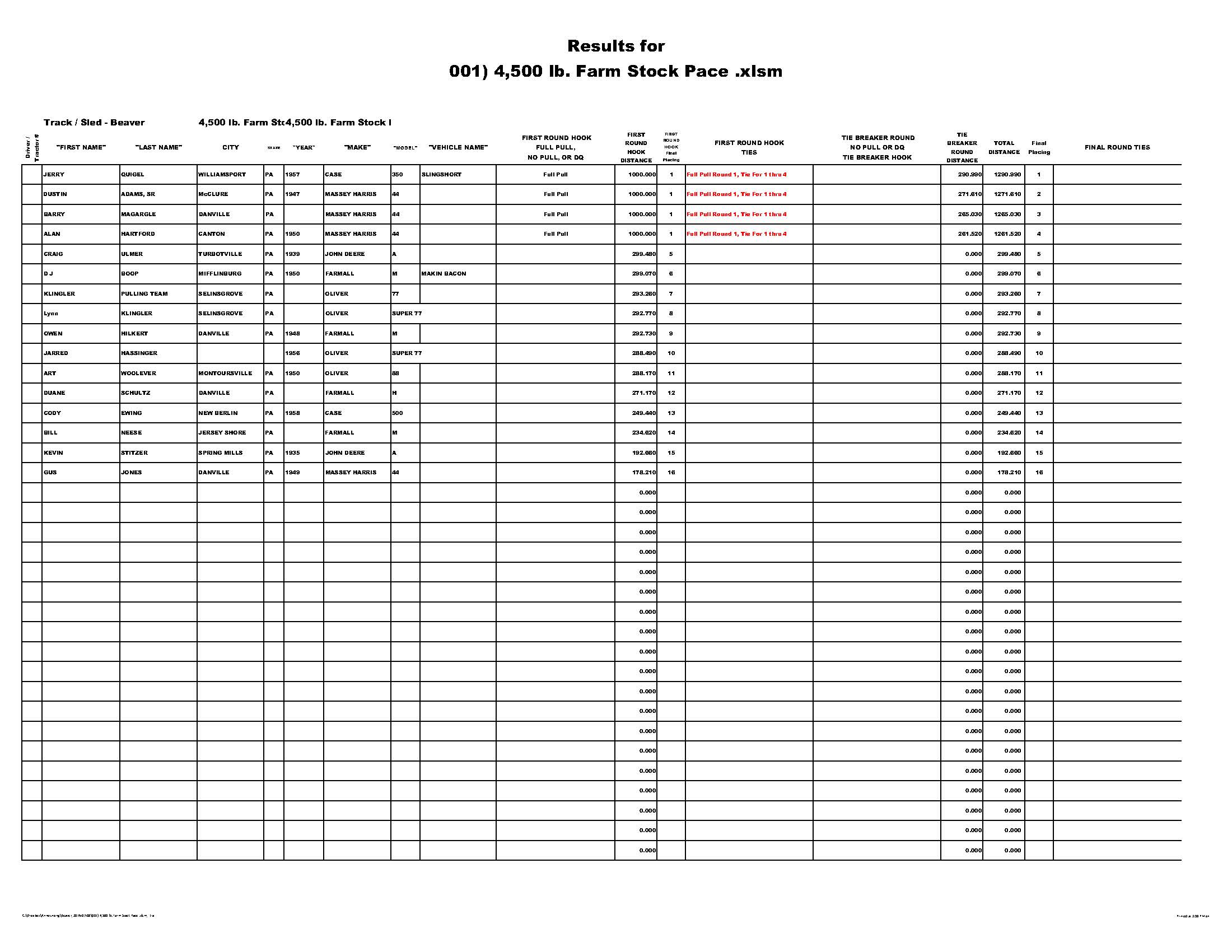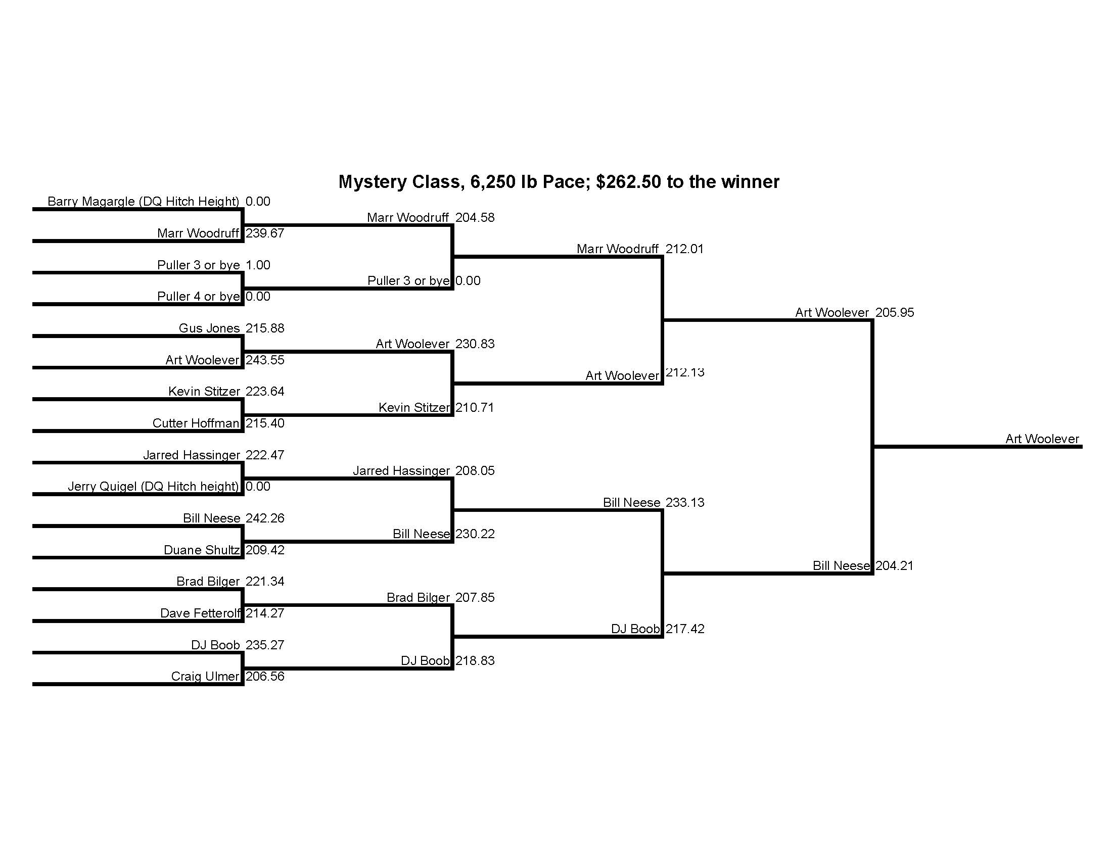 So what is a mystery class? Well it was a mystery to me too. So that is what I named it. The actual weight class was set by the drivers at the drivers meeting and instead of competing as a group with the winner determined by a single pull, the drivers were put into a bracket whereby a pair of drivers were matched up against each other by the luck of the numbers drawn for pulling position. Then the winner of the pair would advance up the ladder of the bracket to take on the other bracket winners until there was only one "winner take all" mystery class champion.